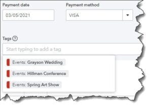 Let’s look at how you’d use tags in an expense. Click the Expenses link in the toolbar, then New transaction | Expense in the upper right. Click the down arrow in the Payee field in the upper left and select + Add new. Enter Billy’s Bridal in the Name field Leave the Type as Vendor and click Save. Back on the Expense screen, select the Payment account, Payment date, and Payment method for the expense (reference number is optional).