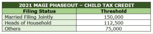 | 2021 MAGI PHASEOUT – CHILD TAX CREDIT | |