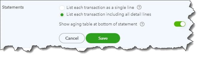 QuickBooks Online offers a couple of options for formatting your statements. To see these, click the gear icon in the upper right corner and select Your Company | Account and Settings. Click the Sales tab and scroll down to the Statements section. Click the pencil icon over to the far right to make any changes needed. You can: